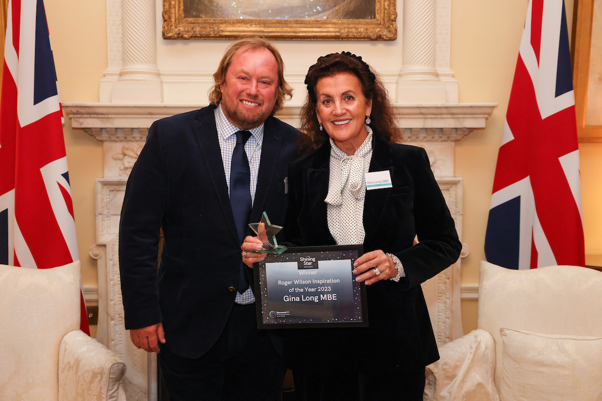 Gina Long MBE receives her award from Roger Wilson CBE. Picture by Rory Arnold/No. 10 Downing Street.